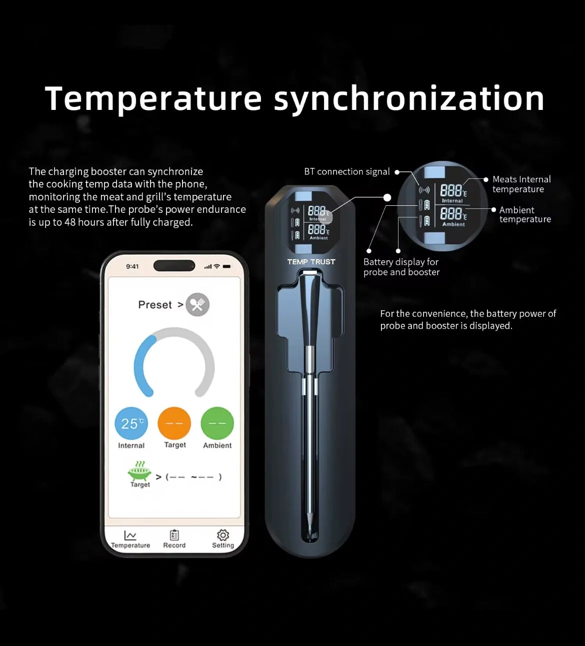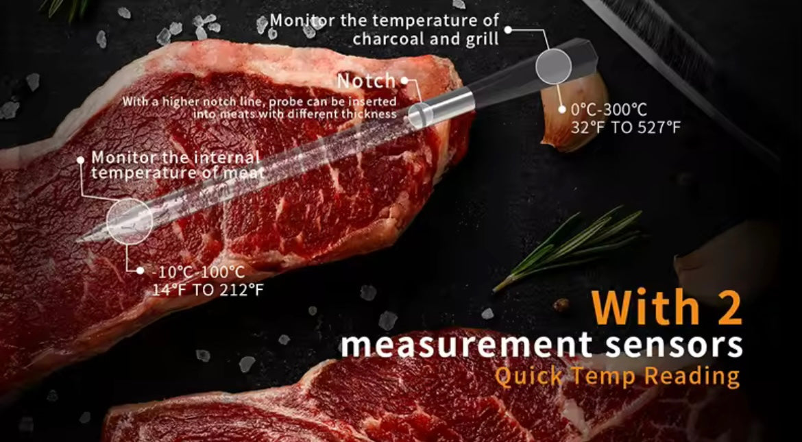 Dual Temperature Tracking – Measures both internal meat temperature and ambient cooking temperature simultaneously.